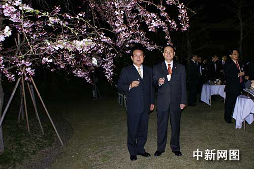 图为武树民总领事(右)与福冈县麻生渡知事在樱花树下。