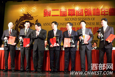 4月4日,在第二届华商领袖年会开幕式及颁奖盛典上,来自世界各地的32位优秀华商获得“世界华商领袖功勋奖”、“世界华人贡献奖”和“世界杰出华人奖”。陕西省省长袁纯清,世界华人协会会长程万琦为他们颁奖。