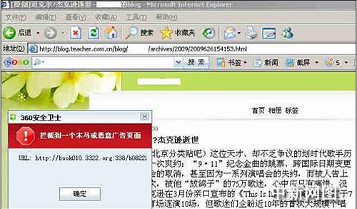 中新网7月1日电 传奇巨星迈克尔杰克逊去世的噩耗震惊了无数歌迷,由于杰克逊在全球范围的巨大影响力,这一不幸事件迅速在互联网掀起巨大波澜。全球歌迷针对此事的搜索量激增,以至让Google公司以为遭遇了恶意攻击。而巨大的关注度和网络浏览量,也招来了依靠流量传播木马的商业黑客。360安全中心近日截获到许多利用“杰克逊逝世”吸引用户的挂网网站。