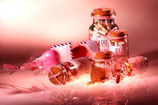 这就是很有人气、创意兼可爱的情书胶囊,号称用整瓶甜蜜的胶囊,道出永远爱你的理由,补充关怀、补充爱!玄机在哪里?打开它试试看吧!原来每个胶囊里面都藏有一个空白小纸条,用来写下对爱人想要说的话,写好后把它卷起来用胶囊里精致的金属小环套住再放回去。如此炮制一周用量的爱,当然,只要你的情话源源不绝,那么预约一整年的爱意表达也很不错。写好后,赶快把它们交给专属你的“病号”,记得要叮嘱对方每日服用,相信没有谁可以抵抗得了这份浪漫,发现秘密后得到的意外惊喜一定会让其感动良久。