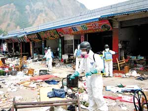 “到处都是断壁残垣,不少地方还有遇难同胞的尸体,即使穿着防护衣、戴着专用口罩和防护面具,还是有浓浓的尸臭味直扑鼻子。在县城里,除了防化部队和我们检验检疫队伍,只有少量的居民在废墟前拜祭。”这是队员黎子强进入北川县城后的第一印象。