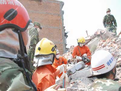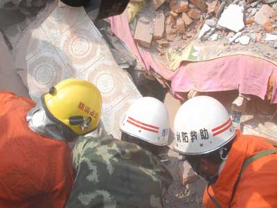 10时25分,消防官兵在对汉旺镇灾区天池矿业公司家属楼进行搜索救援时,突然听到废墟中传来一阵微弱的呼救声。还有幸存者!马上进行救援!全力挽救幸存者的生命!随着现场指挥员的一声令下,参战消防官兵在指挥员的严密组织下科学施救,充分发挥消防部队的装备优势和救援经验,迅速使用液压剪、切割机迅速清除幸存者上方的钢筋、铁条等物,搬除身上埋压的石板、水泥块,为幸存者开辟救生通道。