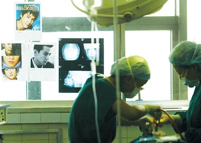 昨日,某医院,香港明星吴彦祖的海报贴在窗户上,医生正为王先生做手术记者 邹飞 摄“颧骨千万不要凹陷!尽可能让脸窄!”昨日,本市某医院整形科,一名高大、帅气的男子持4张香港明星吴彦祖的海报,要求整成吴彦祖的样子。据整形科吴主任介绍,本月已有两个帅哥来医院要求整成吴彦祖。