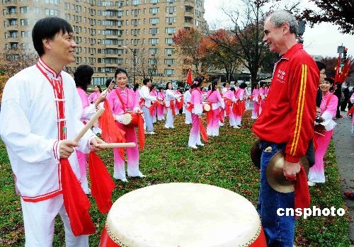 一位来自当地的“洋人”比尔(右)已经多次率领这支锣鼓队参加中国文化节日的活动。