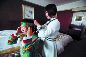 昨日,蒙古族女孩韩笑帮鄂温克族女孩苏玉秀绑头饰。她们将和另外110名各族青少年一起参加国庆庆典。本报记者 孙纯霞 摄