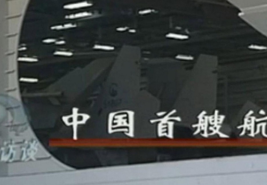 图为中国首艘航母机库内停放的疑似舰载机。(央视截图)