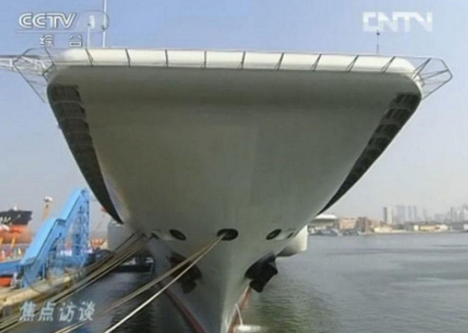 中国首艘航母“辽宁舰”。(央视截图)