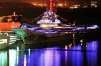 “辽宁舰”节日期间霓虹灯闪亮装点海湾