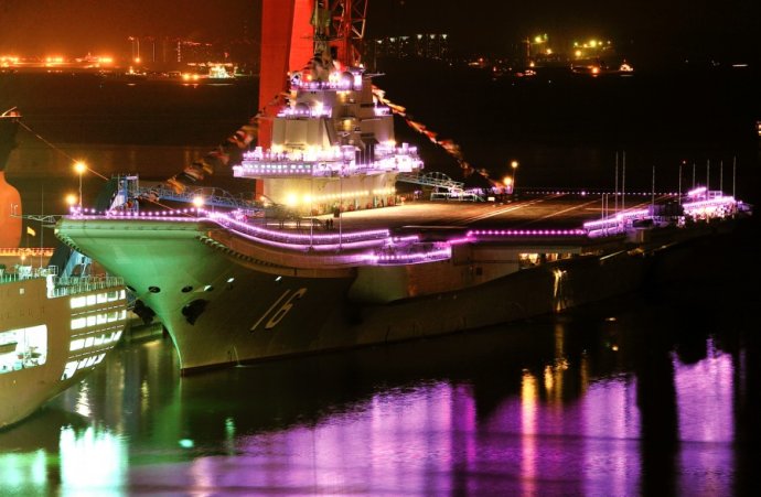 网友拍我航母平台“辽宁舰”节日期间霓虹灯闪亮装点海湾