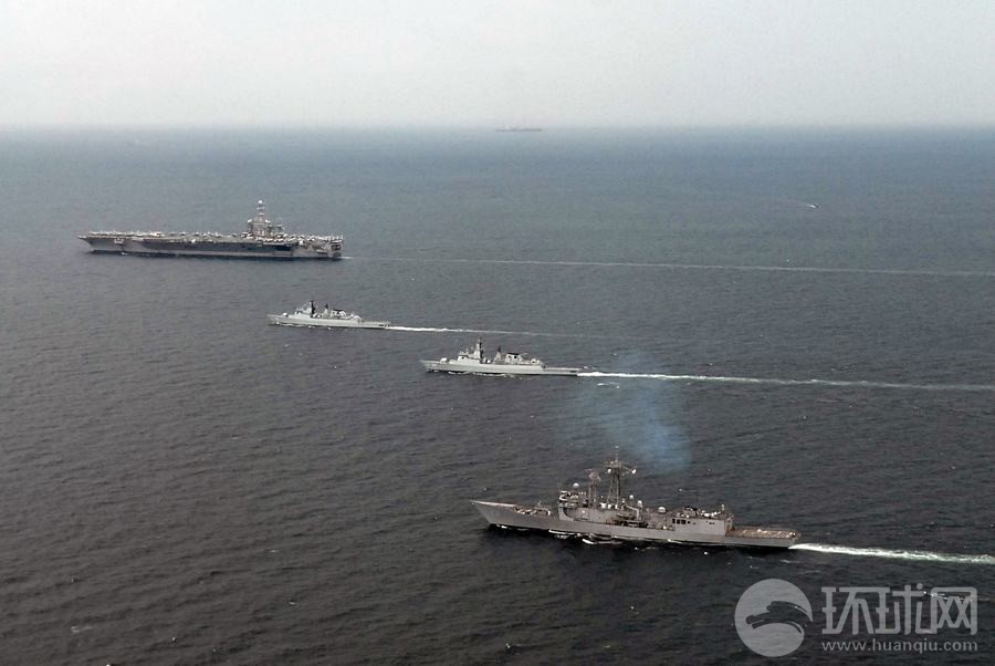 马来西亚海军战舰与美军华盛顿号航母组成编队航行