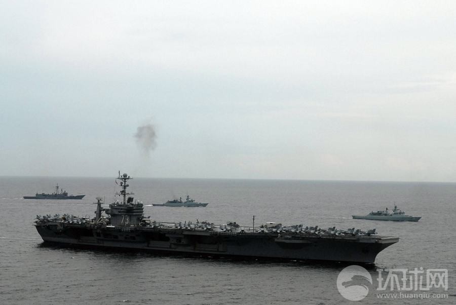 马来西亚海军战舰与美军华盛顿号航母组成编队航行