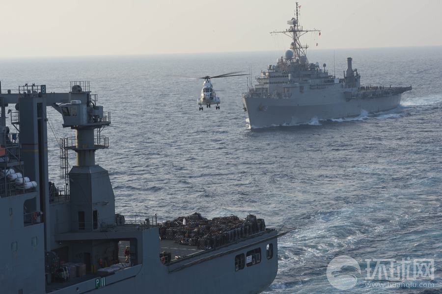演习中美军补给舰演练海上垂直补给