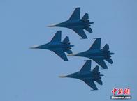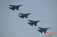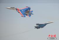 中新网珠海11月12日电(陈海峰)12日下午两点整,俄罗斯勇士飞行表演队5架表演机准时启动进行飞行表演,展示了“加力盘旋”、“跃升半滚倒转”、“向上开花”、“双机对冲”等精彩动作,为观众提供了一场视觉盛宴,体现了苏27优异的机动性能。