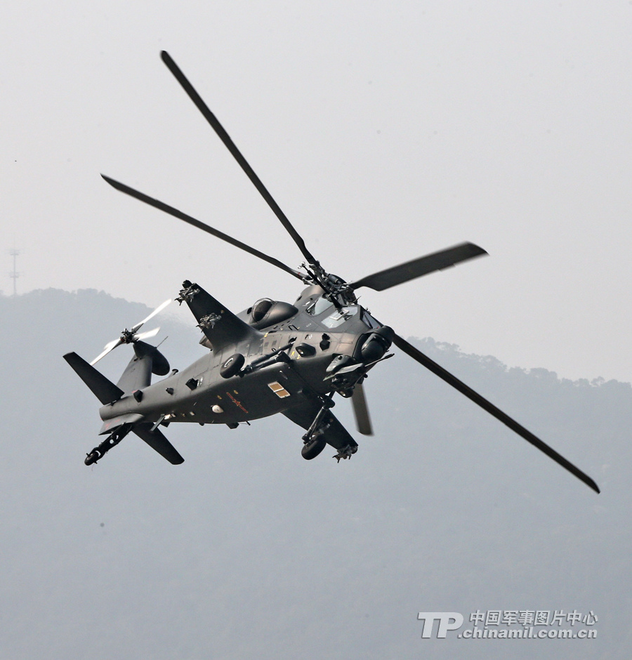 11月13日,我国自主研制生产的武直-10武装直升机亮相在珠海举行的第九届中国国际航空航天博览会,在飞行表演中展示了这款直升机的优良性能。图为武直-10侧旋。记者乔天富 摄
