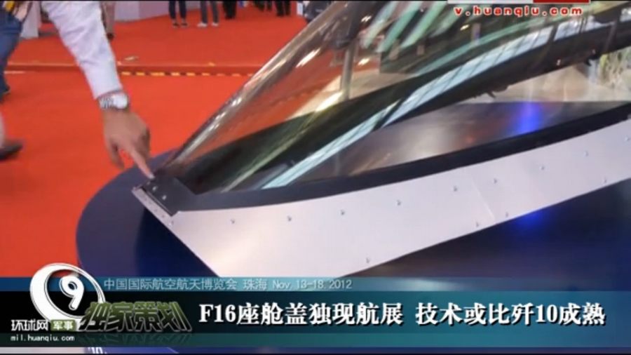 参展商英国汉堡森航空航天公司展出的F-16一体成形座舱罩(环球网视频截图)