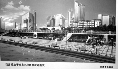 在规划中,大多数地段的堤岸断面结构形式均为退台式护岸,以体现亲水性;个别地段因条件所限堤岸线无法向后退移的,如凯悦饭店、移通大厦附近,则仍采用直立式护岸。