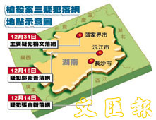 中新网2月5日电元月31日凌晨,经湖南省公安厅和张家界市警方周密布控,公安部督捕、震惊粤港湘三地的香港陆羽茶室“11·30”枪杀富豪林汉烈案主要嫌凶杨文在张家界市落网。至此三名嫌凶全部落网。香港文汇报今天刊载了枪杀案三疑犯落网地点示意图。
