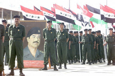 在一个插满称赞萨达姆的旗帜的体育场上,许多贵宾和学生在观看数万名军人照着军乐队的节拍列队行进,时间达两个多小时。这些士兵一面行进,一面挥舞各式武器,其中包括步枪和火箭筒。