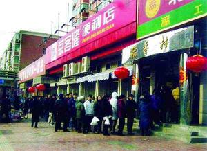 中午1点10分,记者在劲松桥西北角的稻香村分店门口看到,排队的顾客有180多人,队伍一直向西遮挡了该店隔壁两家店铺的街面,蜿蜒到了一栋宿舍楼前。排在最后的顾客已经开始聊天解闷。商店门口的柱子上则贴着“每人限购4斤”的告示,两名男营业员站在柜台外维持秩序,正在买元宵的顾客说,自己9点多就排上了,都快没信心了才轮到。