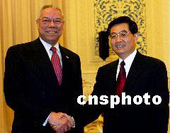 鲍威尔向胡锦涛转达了布什总统和切尼副总统的亲切问候并表示,美中关系在许多领域都取得了重要进展。布什总统和美国政府愿与中国建立更密切的关系,积极加强与中国的合作。美国理解台湾问题对中国是十分敏感的核心问题,美国政府将坚持一个中国政策,遵守美中三个联合公报和美方的有关各项承诺。鲍威尔还介绍了美方对伊拉克及朝鲜核问题的政策和下一步的考虑。(完)