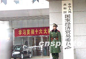 十届全国人大一次会议七日举行代表团全体会议,审议国务院机构改革方案。根据这一方案,中国将组建商务部,以推进流通管理体制改革,国家经济贸易委员会和对外贸易经济合作部将不再保留。图为武警三月在经贸委前执勤。作者:武仲林
