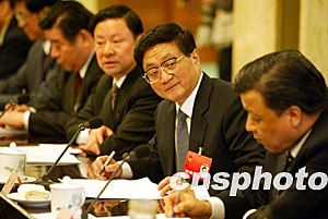 中新社北京三月八日电中共中央总书记胡锦涛和其他几名中共中央政治局常委曾庆红、黄菊、吴官正、李长春,今天下午分别参加了十届全国人大一次会议江苏、浙江、内蒙古、山西、河南代表团的审议。