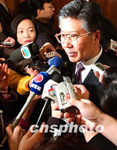 图:交通部部长张春贤接受记者采访