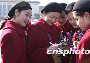 十届全国人大一次会议第七次全体会议十七日在北京人民大会堂召开,图为会议礼仪小姐在翻看与代表的合影。作者:廖文静