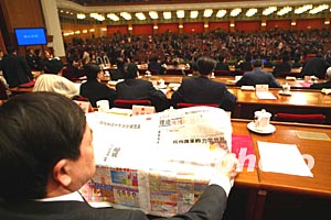 一名代表十七日在十届全国人大一次会议第七次全体会议主席台上,利用选举计票间歇,关注京城报纸有关会议报道的新闻。作者:毛建军