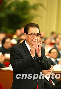 十届全国人大一次会议十八日在北京人民大会堂闭幕,参加会议的前委员长李鹏起立向代表们致意。作者:毛建军