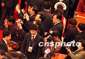 人大代表们三月十八日在北京参加全国人大十届一次会议的闭幕大会前,纷纷拍照留念。作者:贾国荣