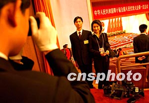 在三月北京举行的十届全国人大一次会议闭幕前,工作人员与CCTV主持人王小丫合影留念。作者:贾国荣