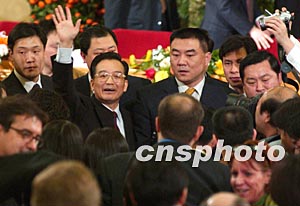组图:温家宝挥手向记者致意