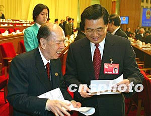 十届人大一次会议十八日上午在北京人民大会堂闭幕,参加闭幕会的马万祺请胡锦涛主席看他的新诗作。作者:毛建军