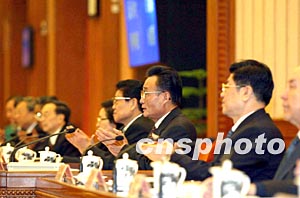十届全国人大常委会一次会议十九日在北京举行,全国人大常委会委员长吴邦国及新当选的副委员长们出席。作者:满会乔