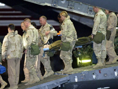 3日,图为19岁的美军女士兵杰西卡·林奇乘美军用运输机到达美军驻德国的拉姆斯汀基地。