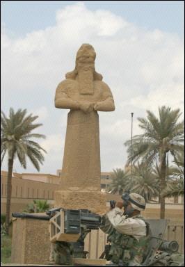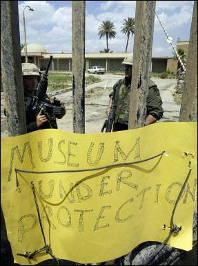 美英联军攻入伊拉克首都巴格达后,陷入严重混乱之中。伊拉克国家博物馆遭到大肆洗劫,大量几千年前的珍贵文物遭到破坏和掠夺。图为美国海军陆战队士兵在伊拉克国家博特馆守卫。