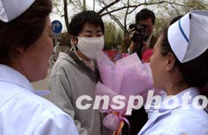 中新社北京四月十七日电(记者曾利明)北京佑安医院今天举行了一个特别的欢送会,欢送又一位痊愈的非典型肺炎患者出院。医院的院长、书记、参加治疗的医生和护士代表一起把患者送出病区。站在医院大门口的康复患者小石是为个二十岁的大学生。满脸喜色的他,一边接受两位护士献上的鲜花,一边点头向半个多月来为他精心治疗、护理的大夫护士致谢:“谢谢你们!谢谢佑安医院!”