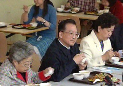 总理径直来到售饭窗口,拿起一个托盘,要了红烧豆腐和木须肉两个菜,一碗玉米粥,一碗红米粥,一碗米饭,有位同学忙着把自己的餐卡借给总理划卡。总理对大家说:“我今天胃口特别好!”同行的吴仪也在一旁风趣地说:“来了北大,看到同学好好的,饭量都大增了!”