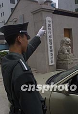 中国银行业监督管理委员会二十八日正式挂牌。银监会将行使原由中国人民银行履行的监督管理职权。图为武警战士在银监会门前执勤。作者:毛建军