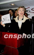 纽约州联邦参议员希拉里.·克林顿五日到访纽约华埠,手举“支持亚洲餐馆”的标语,支持华埠商家。中新社记者:赵海燕