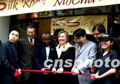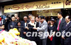 纽约州联邦参议员希拉里.·克林顿五日到访纽约华埠,与社区人士探讨振兴华埠议题,澄清“非典”谣言,并按照中国传统方式为新张的“丝路”咖啡屋剪彩。(希拉里的右边为咖啡屋老板蔡政存)中新社记者:赵海燕
