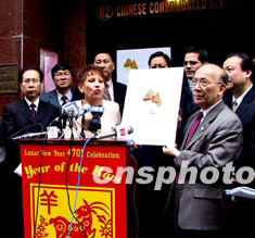 美国会议员维拉贵兹五日站在勿街中华公所门前举起当日出版的《每日新闻》报上登出的一条宣传华埠没有“非典”的公益广告说,华埠是安全的,人们可以放心地到华埠来。(右一为中华公所主席伍廷典)中新社记者:赵海燕