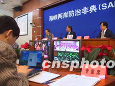 中新社北京五月九日电(应妮 刘舒凌)“海峡两岸防治非典(SARS)研讨会”于今日上午在北京长话大楼举行。来自海峡两岸的医学专家在北京、广州、台北,通过电视电话这一现代传媒进行宛如面对面的研讨交流。