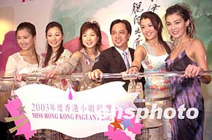 "2003年度香港小姐竞选"9日在香港举行记者会,应届港姐冠军林敏俐(右二)、亚军左慧琪(右一)、季军胡家惠(左三)等与港姐竞选统筹经理何丽全携手主持本地招募宣传片启播仪式。邓庆乐 摄