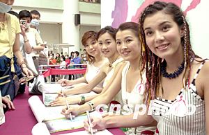“2003年度香港小姐竞选”5月10日在香港奥海城商场举行签名活动。应届港姐冠军林敏俐(右二)、亚军左慧琪(右一)、季军胡家惠(左一)等出席签名宣传活动。邓庆乐 摄