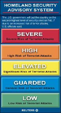 中新网5月21日电 美国国土安全部20日宣布,将全国安全警戒级别从五级彩色预警系统中的中间级别黄色提高到次高级别橙色。