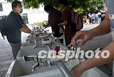 部分复课的北京中学生每日进校后,主动用药皂洗手。面对即将全面复课的学生,北京各学校纷纷采取增建洗手池、加强消毒等措施预防“非典”。中新社记者:郑萍萍