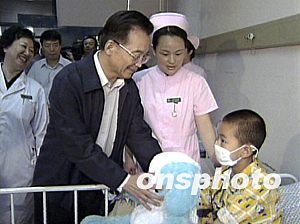 温家宝来到11岁的湖南女孩许碧玉的病床前,关切地询问病情和家庭情况,鼓励她坚定战胜疾病的信心,叮嘱医护人员要精心治疗和护理,让孩子们早日康复。