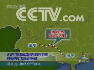 据中央电视台报道,9日零时,因连降暴雨,南昆铁路尾芽区段多处被泥石流掩埋道床、冲空线路。尤其是总长3公里的盘龙山隧道口塌下1万立方米的泥石流,导致近百米线路被掩埋,厚度达6米,隧道内有一公里多线路严重积水,有些险段抢险人员一时无法接近,给抢险工作增加了很大难度。